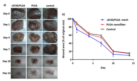 The gross observations of surgical created wound beds with/out treatments were shown in Figure 6a. All wound closed as time. However, the use of a PLGA nanofibrous mesh did not improve wound closure when compared to that of untreated wounds (control). The cECM/PLGA mesh enhanced wound healing, and the wound was almost closed at day 14. On the contrary, untreated mice and mice received the PLGA mesh showed a relatively slow wound healing process. The decrease in wound area indicated that mice received the cECM/PLGA meshes had a significant smaller wound size while there was no obvious difference between PLGA nanofiber and control group (Figure 6b).