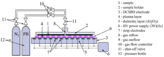 Commercial polypropylene (PP-H, TUPLEX, Brno, Czech Republic) foil with a thickness of 2 mm, manufactured by extrusion, was selected as a model substrate. Polypropylene (PP) samples with surface areas of 25 × 95 mm2 were washed with isopropyl alcohol and dried for 72 hours at room temperature before processing. The water contact angle of the untreated sample was 92° and its surface free energy was 31.9 mJ.m−2. A commercial mixture of propane and butane (mass percent composition: 84% propane, 15% butane, and 1% of C2 and C5 hydrocarbons) admixed into nitrogen with a purity of 99.999% was used in this study.