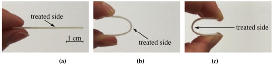 The mechanical properties of the layers were studied by means of nanoindentation using a Hysitron TI950 (Bruker Corporation, Billerica, MA, USA) nanoindenter equipped with a Berkovich diamond indenter. Qualitative bending tests were carried out on coated PP foils to study the bending resistance of the samples. The procedure of the qualitative bending test is shown in Figure 2.