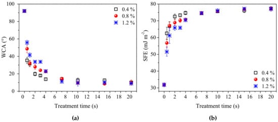 Dependences of surface parameters values on the plasma treatment time: (a) water contact angle (WCA); (b) surface free energy (SFE). Values for three different compositions of processing gas, i.e. 0.4, 0.8, and 1.2% of P-B in nitrogen, are shown.