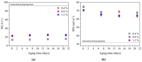 Changes of values (a) WCA and (b) SFE due to aging effect. Values for three different compositions of processing gas, i.e., 0.4, 0.8, and 1.2% of P-B in nitrogen, are shown. A treatment time of 4 seconds was kept in all cases.