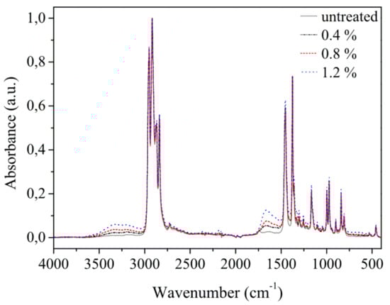 Infrared spectrum of untreated and plasma-treated samples for varied compositions of processing gas, i.e., 0.4, 0.8, and 1.2% of P-B in nitrogen. A treatment time of 15 seconds was kept in all cases.