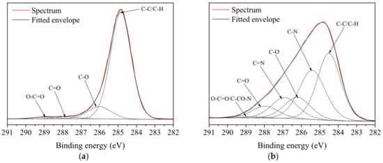 The high resolution C1s peak was fitted with 6 principal components: C–C/C–H (binding energy at 284.8 eV), C–N (285.7 eV), C–O (286.3 eV), C=N (287.1 eV), C=O (287.8 eV), and O–C=O/C–CO–N (289.1 eV), which is consistent with the FTIR-ATR measurements and previous reports [,]. The results of the fits are presented in Table 2 and Figure 7. As shown, the most significant changes after the plasma treatment for PP are the significant increase of the C–N component and the decrease of the C–C/C–H component. The plasma modification resulted in a massive reduction of the hydrocarbon peak to 35% for 1.2% of P-B. Components which correspond to hydrophilic functional groups containing nitrogen (C–N, C=N and C=O–N) were introduced on the PP surface by means of aforementioned plasma modification.