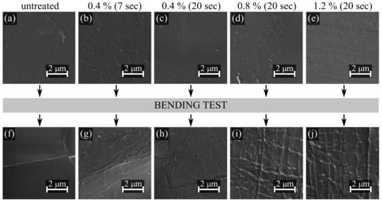 Surface topography of untreated and plasma-treated surface before the bending test; top row (a) to (e); and after the bending test: bottom row (f) to (j). The treatment time was 7, resp. 20 seconds and the composition of processing gas was 0.4, 0.8, resp. 1.2% of P-B in nitrogen.