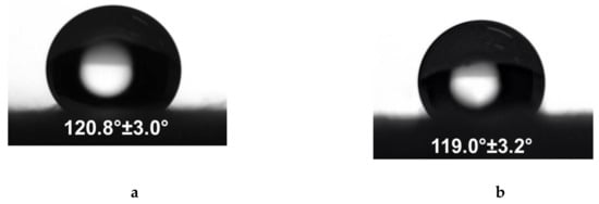 It was found that the contact angle values depended on the composition of the prepared study membranes. Neat CA fibrous membranes were hydrophobic, with a water contact angle of 120.8° ± 3.0° (Figure 3a,c), and the water droplet preserved its spherical shape within 2 h. The measured contact angle values of CA/5-Cl8Q membranes were 119.0 ± 3.2° and were close to those measured for the CA membranes (Figure 3b,d).