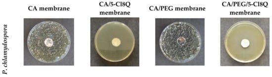 The incorporation of 5-Cl8Q in membranes that were placed in contact with P. chlamydospora and P. aleophilum resulted in complete inhibition for all fungi. In contrast, as expected, the neat CA and CA/PEG membranes did not alter the fungal growth and did not exhibit any antifungal activity. The observation of wide zones of inhibition around all membranes containing 5-Cl8Q is evidence that the incorporated bioactive compound imparts antifungal activity to the prepared novel fibrous membranes.