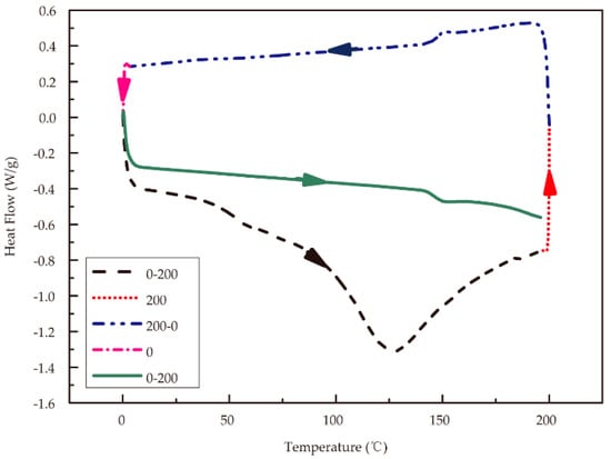 Differential scanning calorimetry (DSC) was performed on approximately 5 mg of material in an open crucible using a Q2000 calorimeter (TA Instruments, New Castle, DE, USA) under nitrogen flow. A heating rate of 20 °C/min was used for standard DSC analysis. The DSC process is shown in Figure 1. The temperature was raised from 0 to 200 °C (black dashed line), held for 2 min at 200 °C (red dotted line), and decreased to 0 °C (blue dashed and dotted line) at the same rate to eliminate the influences of moisture and internal stress in the samples. After the isothermal temperature was maintained for 2 min (magenta dashed and dotted line), the temperature was increased to 200 °C again (green solid line) at the rate of 20 °C/min to obtain an accurate glass transition temperature.