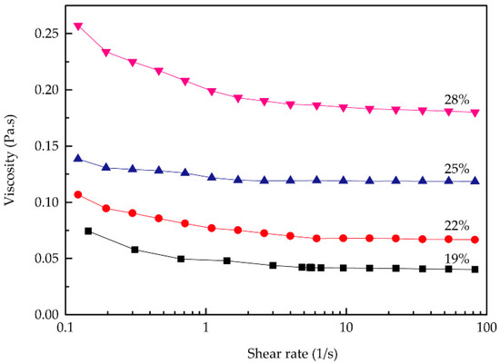 In Figure 2, the viscosity of the RSF aqueous solutions decreased with increasing shear rate, and the solutions exhibited typical shear thinning behavior with variation of the shear rate, indicating that all the solutions behaved as non-Newtonian fluids.
