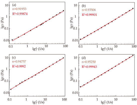 where τ represents shear stress, ͘γ is the shear rate, K is the consistency coefficient, and n is the non-Newtonian index. The logarithm of both sides of Equation (1) was taken, yielding Equation (2) as follows: