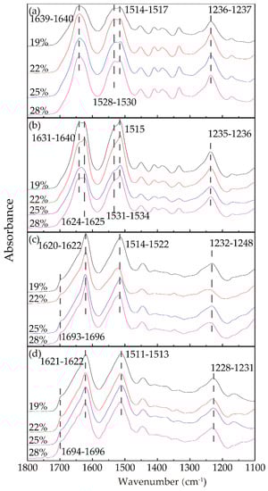 Figure 4 shows the infrared absorption spectra of the RSF samples with different concentrations in four stages, displaying amide I, II, and III absorption bands. As shown in Figure 4a, the trends of the four spectra were mostly similar; the RSF films exhibited absorption bands at 1514–1517 cm−1 (amide II), corresponding to the β-sheet conformation, and 1639–1640 cm−1 (amide I), 1528–1530 cm−1 (amide II), and 1236–1237 cm−1 (amide III), corresponding to the random coil conformation. According to Arrondo et al. [42], the spectral bands between 1620 and 1625 cm−1 were the interchain structures, while the spectral bands between 1630 and 1637 cm−1 were the intrachain structures. Comparing Figure 4a,b, after extrusion through the spinneret into the air gap, the amide I peaks of samples in Figure 4b obviously shifted to lower wavenumbers (from 1639–1640 cm−1 to 1624–1625 cm−1), remaining shoulders at 1631–1640 cm−1. The intensity of the shoulder at approximately 1531–1534 cm−1 of amide II decreased slightly compared with the similar peaks in Figure 4a, while the peaks in amide III scarcely shifted from 1236–1237 cm−1 to 1235–1236 cm−1, corresponding to the random coil conformation.