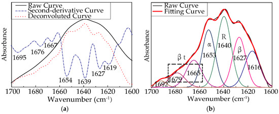 The amide I band (1600–1700 cm−1) was selected for quantitative analysis of the secondary structure of RSF samples [42]. The spectra were smoothed to remove the influence of vapor. The second-derivative spectra were calculated to obtain the positions of the secondary structures, and the deconvolution spectra were acquired by the conservative values of a full width at half maximum (FWHH) of 13.0 cm−1 and a resolution enhancement factor of 2.4 to reverse the effects of convolution on the recorded data, as shown in Figure 5. Peak fitting (Origin) software (v4.12) was used to fit the curve of the deconvolution spectrum of the sample with the Gauss and Lorentz Amp functions until the fitting degree was close to 1, as shown in Figure 5. After adding up the area of sub-spectra corresponding to each secondary structure and calculating the percentage of the area occupied by these sub-spectra, respectively, the content (%) of each secondary structure can be calculated quantitatively.