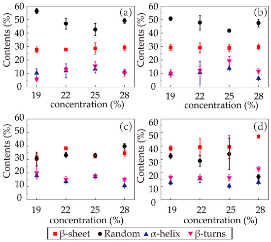 The relative intensity of the spectra of amide I provided the fractional secondary structure contents of random coils (black circles), β-sheets (red squares), α-helices (blue triangles), and β-turns (magenta inverted triangles) in each sample, shown in Figure 6. In the first (F1) and second (F2) stages, the secondary structure distributions were similar. The dominant secondary structure was random coils, followed by β-sheets. With increasing concentration, the random coil content first decreased and then increased as the concentration increased to 28%, and the β-sheet content did not vary much with concentration in the first two stages, while the α-helix and β-turn contents were similarly low.