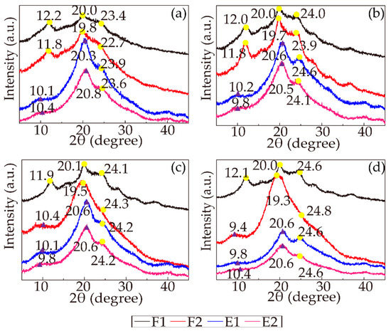 As the most well-known secondary structures, Silk I and Silk II have been extensively analyzed by XRD. Silk I, corresponding to the α-helix conformation, is the metastable structure of fibroin. Silk II, corresponding to the β-sheet structure, is a conformation where all the molecular chains run in alternate directions and form stable antiparallel chain pleated sheets. The transformation from Silk I to Silk II has always been regarded as an important indicator of β-sheet crystallization. Silk I shows three main diffraction peaks at approximately 2θ = 12.2, 19.7, and 24.7°, while Silk II diffraction peaks are located at approximately 2θ = 9.1° and 20.7° [47]. The XRD spectra of the RSF samples are presented in Figure 7. Taking samples 19-F1, 19-F2, 19-E1, and 19-E2 as examples, sample 19-F1 exhibited three main diffraction peaks at 2θ = 12.2, 20.0, and 23.4°, assigned to Silk I, and these three peaks of shifted slightly to 11.8, 19.8 and 22.7°, respectively, for sample 19-F2 but were still the characteristic peaks of Silk I. Nevertheless, Silk II diffraction peaks started to emerge in samples 19-E1 (10.1 and 20.3°) and 19-E2 (10.4 and 20.8°), with only one Silk I diffraction peak remaining at 23.9° and 23.6° in these two stages, respectively. This phenomenon suggested that the crystallinity of the samples treated by ethanol increased. Additionally, for samples with different concentrations, the trends of the peak shifts were incredibly similar; in the first stage, all three characteristic peaks represented Silk I, and in the second stage, most of the peaks shifted but remained Silk I. As the concentration increased, the characteristic peaks of samples 25-F2 and 28-F2 started to shift to Silk II diffraction peaks, meaning that high concentration improved the crystallinity. In the last two stages, all the samples with various concentrations showed distinct Silk II diffraction peaks, while the position of the Silk I diffraction peaks at approximately 24.7° did not change much among all the stages. The number of miscellaneous peaks decreased, and the curves smoothed as the spinning progressed. The aforementioned results showed that all the stages increased the crystallinity and increasing concentration positively impacted the crystallinity. The ethanol strongly induced the Silk II (β-sheet) structure, improving the crystallinity.