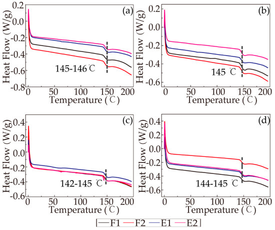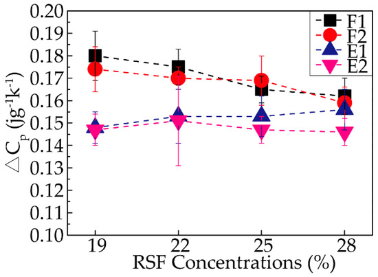 where Ф1 and Ф2 represent the onset and end of the glass transformation from the DSC signal (heat flows), respectively, m is the sample quality, and β is the heating rate. The distinctive specific results of all the samples are exhibited in Figure 9; with increasing concentration, △cp decreased for almost every stage except the third stage (E1), as demonstrated by sample 28-E1, which showed with the increasing concentration, the degree of crystallization became higher to some extent. With the progression of the spinning process, the △cp of all the samples decreased except for sample 25-F2. In addition, the degree of the decrease in the △cp was most significant between F2 and E1, followed by ethanol coagulation treatment and air gap treatment. In summary, the ethanol coagulation played an important role in promoting the crystallinity of the silk fibroin, while the four stages all affected the crystallinity to an extent. The conclusions were consistent with the results mentioned above.