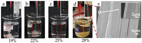 (a–d) Effect of concentration on the dry-wet spinnability of the RSF solutions; (e) Morphology of the RSF fibers (28-E2).