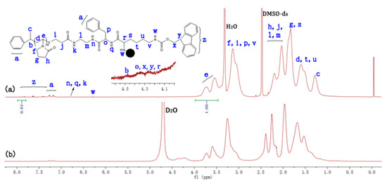The 1H NMR spectra of PNVP-b-dendr(Phe-Lys)n (n = 1–3) were fully consistent with the proposed chemical structures (Figure 1a, Figures S1a and S2a). For example, the proton characteristic signals of the PNVP repeat-units in the 1H NMR spectra of PNVP-b-dendr(Phe-Lys) (Figure 1a) can be expressed in the peaks marked with letters from d to h, d at 1.74–1.42 ppm (m, CH2), e at 3.98–3.46 ppm (m, NCH), f at 3.31–2.85 ppm (m, NCH2), g at 1.99–1.75 ppm (m, CH2), h at 2.40–1.99 ppm (m, COCH2), and the resonance signals of dendron protons of Fmoc group and phenyl group at 7.95–7.13 ppm, α-methine group of Lys, α-methine group of Phe, methine group and methine group of Fmoc group at 4.43–4.16 ppm.