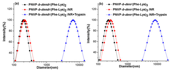 The particle size in PNVP-b-dendr(Phe-Lys)2 (a) and PNVP-b-dendr(Phe-Lys)3 (b) before and after Nile red was loaded, and the particle size of the micelle solution after the incubation with trypsin.