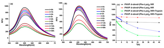 Fluorescence spectra of Nile red in PNVP-b-dendr(Phe-Lys)2 (a) and PNVP-b-dendr(Phe-Lys)3 (b) micelles after the incubation with trypsin, and effect of adding trypsin on the release rate of Nile Red (c).