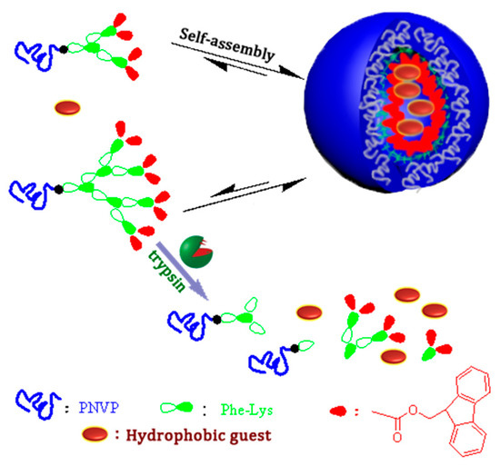 Schematic diagram of self-assembly and enzymatic hydrolysis of PNVP-b-dendr(Phe-Lys)n (n = 2, 3) with the same hydrophilic block.