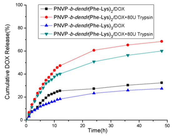 We investigated the trypsin-triggered release of doxorubicin (DOX) from the LBDCs micelles in PBS buffer (pH = 7.4) at 37 °C to simulate the physiological environment. The encapsulation efficiency (EE) of DOX in PNVP-b-dendr(Phe-Lys)2 and PNVP-b-dendr(Phe-Lys)3 micelles was 71.2% and 77.6%, respectively, when the feeding amount of DOX/ LBDCs (wt/wt) was <5%. The release of DOX in micelles was very low about 30% at 48 h in the absence of trypsin. However, DOX-loaded micelles showed significant release of DOX with about 15% release at 2 h and about 65% release at 48 h after the addition of an 80 U/mL solution of trypsin (Figure 8). The cumulative release of DOX-loaded micelles was not very accurate because the copolymers produced insoluble precipitate upon enzymatic activation and was mixed with DOX. The mixture was stirred in PBS buffer (pH = 5) to fully dissolve the DOX and then the fluorescence intensity of the resulting solution was measured. We found that the cumulative release of the drug reached more than 80% at 48 h upon trypsin treatment. The reason for the remarkably increase of DOX release may arise from the enzyme-induced disassembly of DOX-loaded micelles at physiological pH condition.