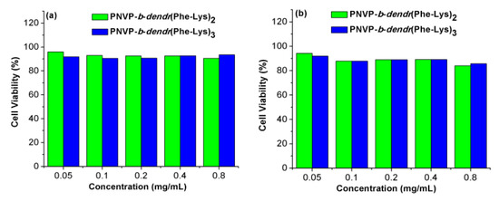 To apply the LDBCs in drug delivery field, the biocompatibility of PNVP-b-dendr(Phe-Lys)2 and PNVP-b-dendr(Phe-Lys)3 was investigated by cytotoxicity assessments. The LDBCs at varying concentrations were incubated with human lung epithelial cells (BEAS-2B) or human liver cancer cells (SMMC-7721) for 48 hours. The viability of BEAS-2B and SMMC-7721 cells after incubation with the copolymers was determined via MTS assay. As shown in Figure 9, no apparent toxicity effect was found on BEAS-2B and SMMC-7721 by the LDBCs when the concentration of the LDBCs increased from 0.05 to 0.8 mg/mL. These results demonstrate that PNVP-b-dendr(Phe-Lys)2 and PNVP-b-dendr(Phe-Lys)3 have a good biocompatibility within limit concentration and are suitable for drug delivery.
