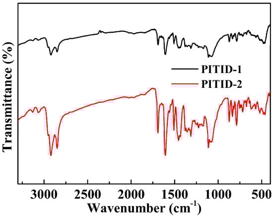 To confirm the structures of the random copolymers with different donor/acceptor monomers, including thiophene, isoindigo, and indolo[3,2-b]carbazole derivative units, the FT-IR spectra of the two materials PITID-X (X = 1 and 2) were measured and illustrated in Figure 1. The transmittance curves showed that several similar characteristic peaks were identified due to the asymmetrical stretching vibration or the skeletal vibration of specific chemical bond/groups. For the polymer PITID-1, the peaks, including 2922 cm−1 (asymmetrical stretching vibration of –CH2– group), 2851 cm−1 (symmetrical stretching vibration of –CH2– group) were observed for the alkyl side chains in IIG or ICZ. The peak at 1690 cm−1 corresponded to the stretching vibration of ketone (C=O) in the isoindigo unit. Three peaks at 1607, 1508, 1452 cm−1 may derive from the skeletal vibration of the thiophene, ICZ, or IIG ring. The peak at 1313 cm−1 referred to the –C–N– stretching vibration of IIG or ICZ groups. The absorption peaks at 1170 cm−1, 1111 cm−1 were assigned to the in plane bending vibration of the C–H bonds alongside the skeleton of the whole polymer chain. Other peaks at 872, 787, and 718 cm−1 were due to the out-of-plane bending vibration of C–H in the aromatic rings. For FT-IR spectra of the PITID-2, the positions of characteristic peaks were similar to that of PITID-1, although the absorption intensity owed a slight difference. The results showed that the backbones of the two copolymers both contained the monomeric units mentioned above [31].