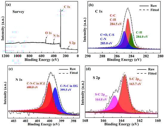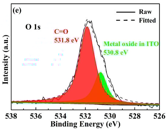 Taking the polymer PITID-2 for example, the survey scan revealed the presence of the four elements including carbon, nitrogen, sulphur, and oxygen, as shown in Figure 2a. The C 1s gross peak of the random copolymer PITID-2 can be deconvoluted into three peaks, as illustrated in Figure 2b. The peak located at a binding energy (B.E.) of 284.0 eV originated from C–H throughout the whole backbone. The peak located at 284.5 eV was attributed to C=C, which can be originated from the carbon atoms in the aromatic skeleton (C=C) of the monomers including ICZ, IIG, and thiophene blocks. The component located at 285.0 eV was assigned to C–S, C–N bonds of the three monomeric units. The N 1s peak shape (shown in Figure 2c) can be deconvoluted into two peaks, the peak at 399.5 eV can be attributed to C–N–C of the isoindigo block [32]. And the component at 400.0 eV is a typical position of a C–N–C bond in an ICZ unit. [33]. The relative filled areas of the two peaks in N 1s correspond to the feed ratios of IIG and ICZ units, respectively. The S 2p spectra illustrated in Figure 2d can be assigned to typical deconcvoluted S 2p3/2 (163.7 eV) and S 2p1/2 (164.8 eV) spin orbit splitting peaks, which was originated from C–S of the thiophene block. Figure 2e illustrated that two peaks of the O 1s profile can be deconvoluted, the peak located at 531.8 eV can be attributed to C=O unit of isoindigo block and the peak at 530.8 eV can be attributed to the metal oxide in ITO substrates. Similar results were obtained from the polymer PITID-1 (Figure S2 in Supplementary Materials). XPS curves of the two polymers showed that the random copolymers were successfully synthesized by incorporating the three monomers, indolo[3,2-b]carbzazole, isoindigo and thiophene units with different feed ratios.