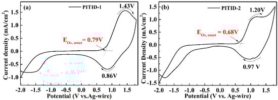 As shown in Figure 3, the copolymers illustrated one obvious reversible redox peak at 1.43/0.86 V and 1.20/0.97 V for PITID-1 and PITID-2, respectively, during the p-type doping process. However, no obvious redox peaks were observed during the n-type doping scanning for the two polymers, it may originate from unstable anion radicals that can be easily disturbed by oxygen or water in the ambient conditions accompanying the transportation of the anions in the supporting electrolyte. For the polymer PITID-1 and PITID-2 (shown in Figure 3), the onset oxidation potentials (Eonset,ox) were 0.79 V and 0.68 V, respectively. Compared with PITID-1, the lower values of Eonset,ox for PITID-2 may result from the smooth charge transfer between the donor and acceptor units due to the increased acceptor content (isoindigo unit).