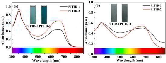 Compared with the spectra of polymer solutions in the visible region, the maximum absorption peaks of corresponding polymer films illustrated obvious red shift. The shorter-wavelength absorption peaks of both polymer films showed similar positions as in solution (at 355 and 353 nm for PITID-1 and PITID-2, respectively), whereas the longer-wavelength absorption peak shifted 6 nm up to 674 and 672 nm for PITID-1 and PITID-2, accompanying the decrease of relative intensity of two absorption bands. This behavior may be due to the aggregation effect of the polymer in the solid state. The onset absorption wavelength (λonset) that had a negative correlation with the optical energy band gap (Egopt) was obtained as 795, 786 nm and the Egopt values were calculated to be 1.56 and 1.58 eV for PITID-1 and PITID-2, respectively. From the inserted picture in Figure 4a,b, the solutions showed the colors of light cyan, dark cyan for PITID-1 and PITID-2, respectively. In the solid state, the color of the two polymers both illustrated dark gray that was not easy to identify by naked eyes.
