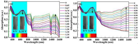 Two-dimensional (2D) spectroelectrochemistry profiles of (a) PITID-1 and (b) PITID-2 copolymer films on ITO-coated conductive slides in a 0.2 M TBAPF6/ACN electrolyte solution in different pulse voltages from 0 V to 1.35 V. The inserted photos show the color cyan in their neutral state (0 V, left) and the color gray in the oxidized state (1.35 V, right).
