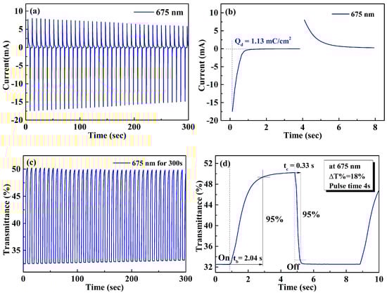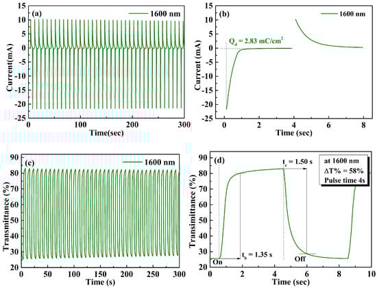 (a) Current–time switching curve of PITID-2 film between 0 and 1.35 V in a time interval of 4 s. (b) The second cycle of current–time curve. (c) Transmittance–time curve of PITID-2 last for 300 s at 675 nm. (d) The bleaching time (tb) and the coloration time (tc) of PITID-2 at 1600 nm.