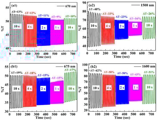 In practical applications of the electrochromic devices, the retention time at a certain voltage difference is dynamically variable, so it is very important to access the dependence of the optical contrasts on the retention times of the polymers during the dynamic switching. For this purpose, the interval times (at the neutral or oxidized state) were set at 10, 4, 2, 1, and back to 10 s, respectively, in the square wave potential step technique, and the optical contrasts were monitored. For PITID-1, the optical contrast at 670 nm were recorded as 12%, 11%, 7%, 5%, and 9%, respectively, at the interval time of 10, 4, 2, 1, and 10 s (Figure 8(a1)). As the time interval was reduced from 10 s to 1 s, the optical contrast was reduced by 31.2 %. At the wavelength of 1600 nm, the transmittance contrasts were 40%, 33%, 23%, 16%, and back to 26% at the interval time of 10, 4, 2, 1, and back to 10 s, respectively (Figure 8(a2)). There was a 30.6% loss in optical contrast as the switching time was decreased from 10 to 1 s. The relationship between the contrast differences and the time interval applied on the polymers was also investigated in the same way, and similar results were obtained for PITID-2 (Figure 8(b1,b2)). Based on the above data, it was found that optical contrasts have some degree dependence on the interval times, so it was necessary to estimate the response time at specific time intervals.