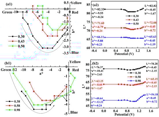 In order to obtain the color and colorimetric characters of the two materials, the measurement with the CIE 1976 L*a*b* color space was used to record the instant color that cannot be distinguished by naked eyes during the variation of applied potentials. Here, L* represents the lightness of the color from black to white that can be transformed into values from 0 to 100. a* represents how much red (positive value) versus green (negative value) and b* represents how much yellow (positive value) versus blue (negative value). The positive values of a* and b* mean red and yellow, respectively, or vice versa.
