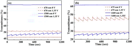 Open circuit memory property is an important factor for electrochromic materials or devices, the long residence time can reduce the energy consumption during the switching process of electrochromic devices. The open circuit memory curves of the copolymers films that were applied at constant potential (0 or 1.35 V), were recorded at the wavelength of 670/1500 nm and 675/1600 nm for 1 s for every 120 s time interval for PITID-1 and PITID-2, respectively. As shown in Figure 10a, the film of PITID-1 kept an unchangeable transmittance at 670 nm when the film was in the neutral state. However, the profile show jagged curve as the polymer was kept in the oxidized state by intermittent potential at 1.35 V for 1200 s, unstable but recoverable absorption retention characteristics. Similar variation tendency can be obtained for PITID-2 in Figure 10b. The results show that the two materials show good optical memory at the neutral state, and the memory in the oxidized state could be compensated by the pulse applied voltages.