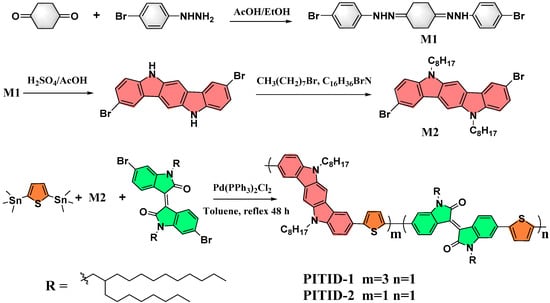 The synthetic route of the conjugated polymers PITID-1 and PITID-2.