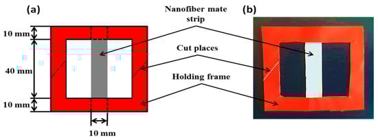 Testing the effect of TPU addition into the PVDF mechanical properties was performed by cutting the nanofiber mat into rectangular pieces (1 × 6 cm). The samples were placed between two cardboard holding frames with gauge length of 4 cm as shown in Figure 1. A universal testing machine (TENSO LAB 5000, Mesdan, Italy) was used to perform the tensile test. The tensile test was conducted at a strain rate equal to 10 mm/min with zero initial loads. The load cell used was equal to 100 N.