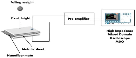 Piezoelectric voltage signals were detected from the synthesized PVDF/TPU nanofibers mats through a simple set-up of an impulse loading test, as shown in Figure 2. Nanofibers mats of dimensions 2 × 2 cm were placed between two foil sheets and exposed to impulse loading test of different weights. In this testing, different weights fell down on the sandwiched mats from a fixed small height of 1 cm. Then, the generated voltage was detected through two connected shielded wires, pasted on the foil sheets, to a pre-amplifier (Stanford, CA, USA) followed by a high impedance mixed domain oscilloscope (Tektronix MDO 3012, Beaverton, OR, USA).