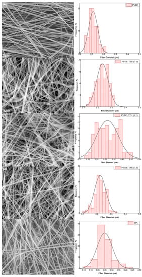 SEM images with fiber diameter distribution for PVDF/TPU composite nanofiber. (a) PVDF (b) PVDF/TPU 3:1, (c) PVDF/TPU 1:1, (d) PVDF/TPU 1:3, and (e) TPU.