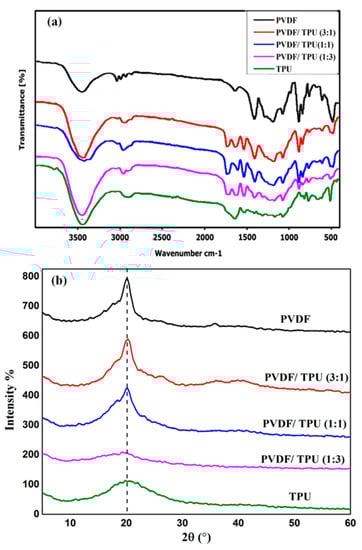 (a) FT-IR and (b) XRD Analysis of PVDF/TPU Composite Nanofiber.