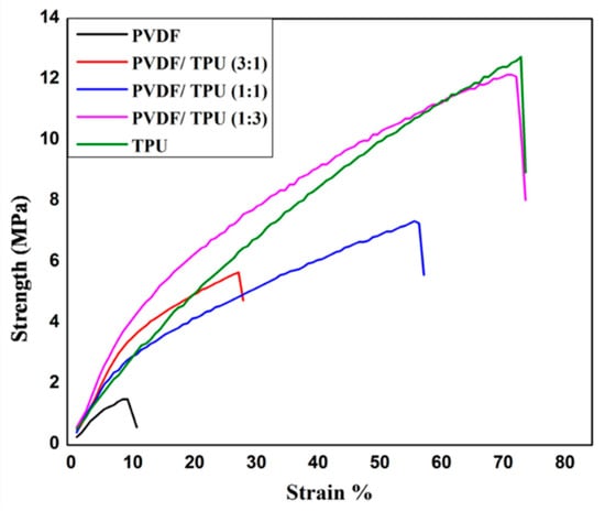 In order to explore the mechanical properties of the newly developed composite, a tensile strain test was conducted and the recorded stress-strain curve is presented in Figure 5. It was clearly noticed that TPU and PVDF/TPU 1:3 exhibited the highest mechanical properties with maximum stress of 14.98 and 13.2 MPa respectively and breaking strain of 97.25% and 85% respectively. This can be attributed to the excellent mechanical properties of TPU as an elastomer polymer with high tensile stress and elasticity.