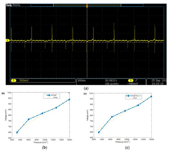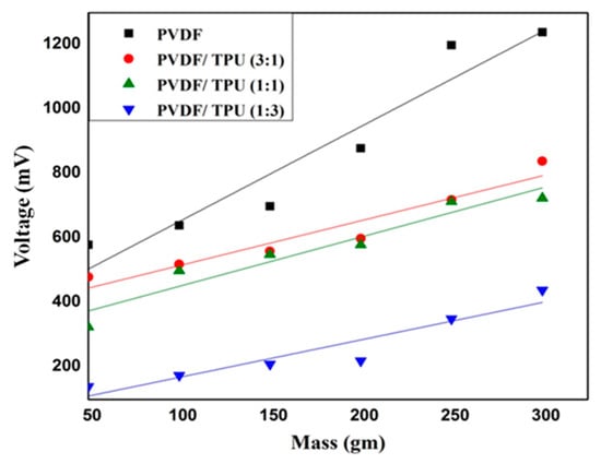 Regarding the piezoelectric measurements, Figure 6 shows the piezoelectric response of different PVDF/TPU nanofibrous composite membranes under impulse loading impact from a fixed height of 1 cm. Within all samples, it could be observed that the generated electric potential response increased with increasing the exposed weight. Although the weights were thrown from a very short height (1 cm) which means very small impact force would be generated, electric potential was generated and increased by increasing the dropped weights. The pure PVDF had the highest values of generated voltage and higher sensitivity of 2.9 mV/gm compared to other samples. By increasing the ratio of TPU in the nanocomposite, the piezoelectric sensitivities were reduced as shown in Figure 6. Table 3 summarizes the impulse loading piezoresponse measurements along with the toughness results. Figure 7a shows the generated periodic voltage from one PVDF nanofiber mat under applied periodic pressure according to a force of 1 N. The mean peak-to-peak voltage was measured according to the change of applied force and consequently the applied pressure. We found that there was a close linear relation between generated voltage and applied pressure with sensitivity up to 25 mV/kPa, or corresponding to 70 mV/N, as shown, for example, in Figure 7b,c.