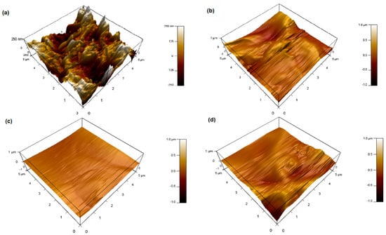 PFM Height retrace at 10 V applied potential for different PVDF/TPU blend ratios. (a) PVDF, (b) PVDF/TPU (3:1), (c) PVDF/TPU (1:1), and (d) PVDF/TPU (1:3).