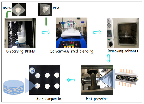 Figure 1 shows the method to fabricate the aligned BNNs–PFA composites via solvent-assisted blending followed by hot-pressing. First, the produced BNNs were dispersed in ethanol via sonication. Then, PFA powder (obtained from DuPont, Wilmington, DE, USA) was added into the BNNs dispersions and mixed while removing ethanol with a heating magnetic stirrer for 6 h at 60 °C. Afterwards, the BNNs–PFA slurry was dried at 120 °C for 24 h in a vacuum oven to remove the residual ethanol. The obtained BNNs–PFA powder was put into a mold and heated at 400 °C for 1 h. The molten BNNs–PFA sample was hot-pressed at 380 °C under a pressure of 15 MPa for 15 min, then cooled to room temperature under the ambient pressure to form bulk composites [28]. The properties of these composites were then examined. We performed the above steps for PFA composites with BNNs contents of 1, 5, 10, 15, 20, 25, and 30 wt %.