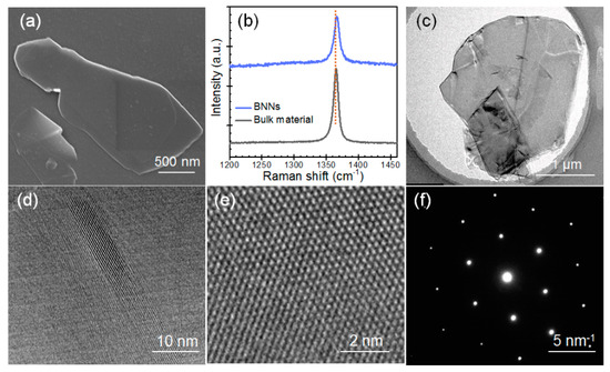 SEM image (a), Raman spectra (b), Transmission Electron Microscopy (TEM) image (c), high resolution TEM (d,e), and electron diffraction pattern (f) of the BNNs.