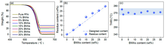 (a) Thermogravimetric analysis curves for pure PFA and the BNNs–PFA composites. (b) The relationship between the initial designed and residual BNNs content obtained in thermogravimetric analysis. (c) The heat resistance index (THRI) for pure PFA and the BNNs–PFA composites. THRI = 0.49[T5 + 0.6(T30 – T5)], where T5 and T30 is the temperature at 5 and 30 % weight loss in (a), respectively.