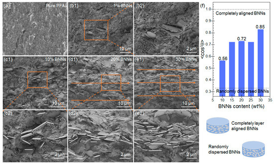 SEM images of the fractured surfaces for pure PFA (a), PFA composites containing 1 wt % (b1,b2), 10 wt % (c1,c2), 20 wt % (d1,d2) and 30 wt % (e1,e2) BNNs. (f) The <cos2θ> determined based on the image analysis of frequency versus θ from the SEM images of PFA composites containing 10, 15, 20, 25, and 30 wt % BNNs.