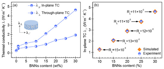 (a) In-plane TC (λ‖) and through-plane TC (λ⊥) of the PFA composites with layer aligned BNNs. (b) Extraction of Rk values for BNNs–PFA composites based on the EMT model. The unit of the Rk is m2·K·W−1.