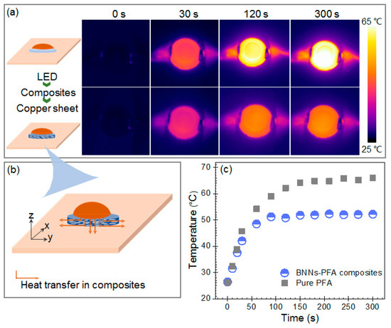To evaluate the application potential of the fabricated BNNs–PFA composites, we measured their heat dissipation capability when attached to a high-power light-emitting diode (LED). Specifically, the back surface of a LED lamp was attached to a composite (diameter: 30 mm; height: 1 mm), and a thin copper sheet was connected to the bottom side of the composite. After the LED was switched on, the temperature of LED was measured using an infrared thermal imaging instrument (E60, FLIR Systems, Portland, OR, USA). We compared the heat dissipation capability of PFA composite with 30 wt % layer aligned BNNs with that of pure PFA.