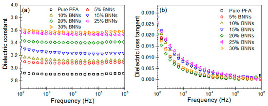 Apart from a high TC, electronic packaging materials also need a low dielectric constant and dielectric loss. Generally, a low dielectric constant can reduce the time of signal propagation in electronic devices, while a low dielectric loss tangent can decrease heat production of dielectric materials under electric field. Figure 7a,b depicts the variation of dielectric constant and dielectric loss tangent as a function of frequency for pure PFA and the BNNs–PFA composites. The dielectric constants of pure PFA and composites all had excellent frequency stability. However, the dielectric constants of these PFA composites increased slightly with the increasing BNNs content. This is because the increasing BNNs content introduce more charge carriers [12,38]. Nevertheless, the dielectric constants for all the composites were maintained even at a low level. In particular, the 30 wt % BNNs–PFA composite had a dielectric constant of 3.57 at frequency of 103 Hz, which increased slightly in comparison with that of pure PFA (~2.90).
