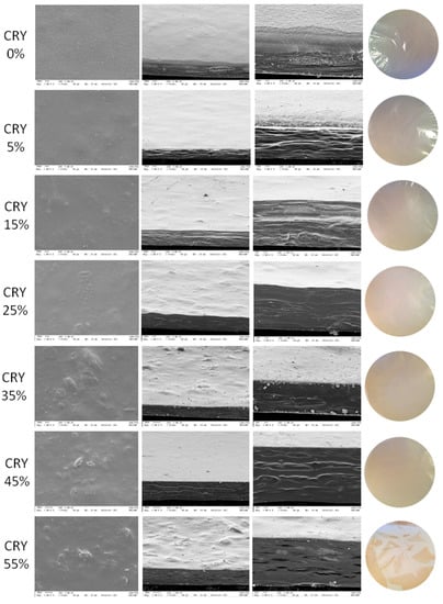Scanning electron microscopy (SEM) images of surface (column 2, images with 1000× magnification), cross section (column 3, images with 1000× magnification, and column 4, images with 3000× magnification), and photographic images (column 5) of the edible films based on arrowroot starch and gelatine incorporated with 0, 5, 15, 25, 35, 45 and 55% cranberry.